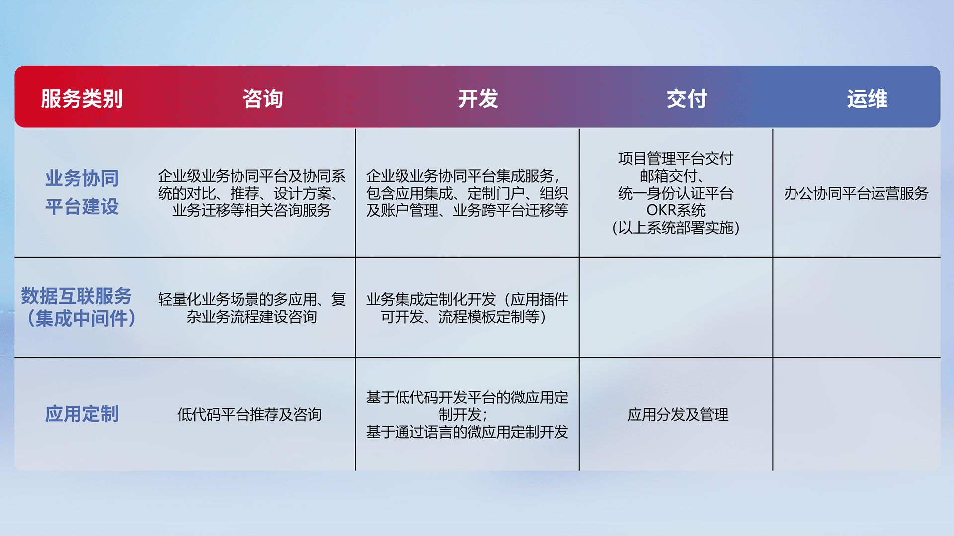 针对钉钉、、、企微、、、IDaas等平台级产品提供产品的规划、、、、方案、、、交付、、、、定制化开发等服务,,实现如统一协同办公、、、、智能客户服务、、混合会议管理、、智能数据查询、、、、等业务场景,,,,实现数字化转型。。
