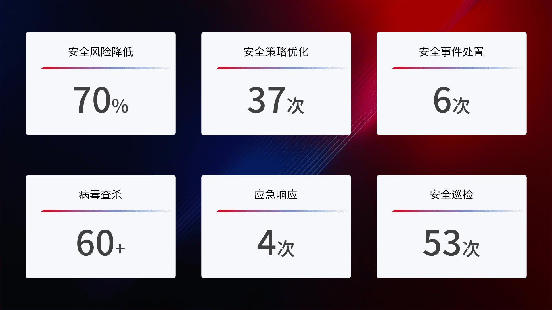 提供全面的安全事件报告体系,,,,包括处置报告、、、周报、、季度和年度总结,,结合持续监控,,帮助客户深入了解网络安全状况。。