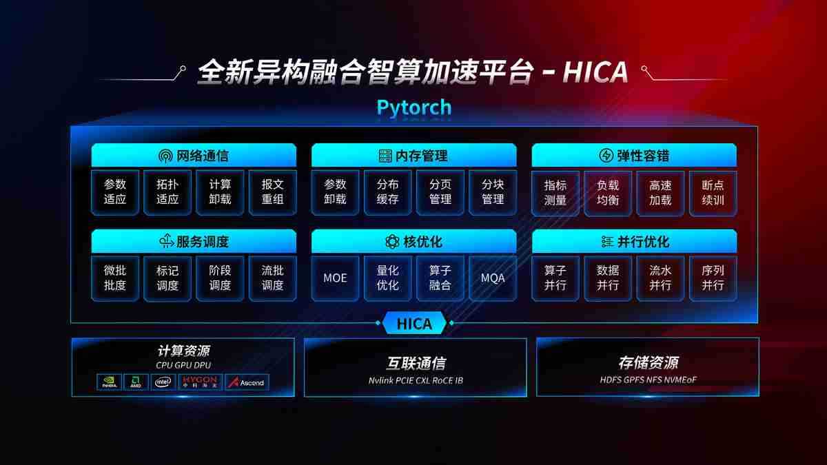 通过自研的服务层、、中间适配层、、以及调度编排算法,,,采用数据并行、、模型并行等多种并行方式,,把并行计算任务进行有效的分解,,,,使其分别由相应的软件栈和算力资源来承接。。当GPU资源变化,,,,HICA可以实时动态调度计算子任务并调整模型拓扑和架构,,,以充分聚合各种算力资源。。。。