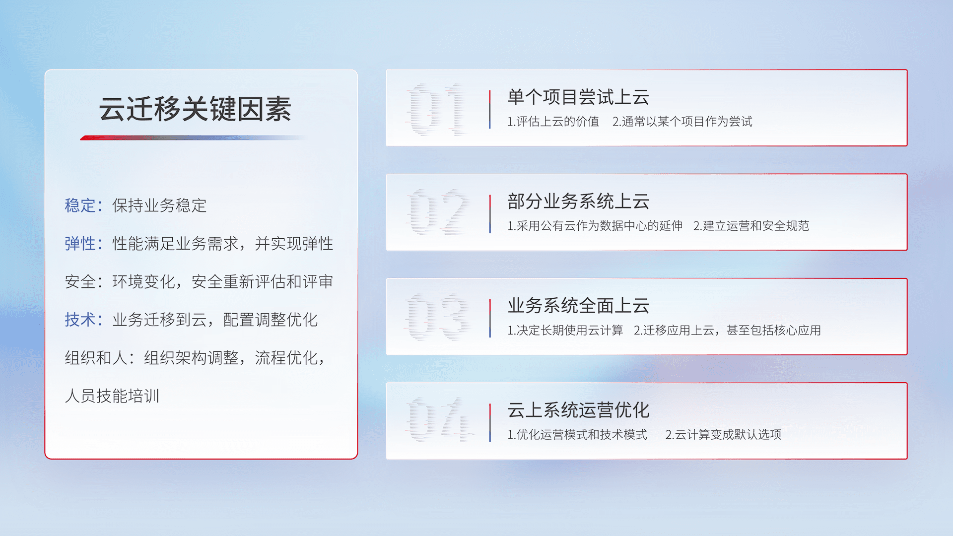 结合实际业务,,从规划设计、、、云平台选型、、、云原生改造、、数据迁移、、、集成交付,,迁移全过程为客户识别最佳上云路径,,,,做好风险识别管理,,设计网络架构、、、、身份权限、、、安全审计合规、、操作审计、、、日志审计、、、监控告警策略、、、、多站点容灾设计等,,,对云上基础设施进行整体规划,,,提升IT治理水平,,以满足弹性、、、高可用、、、、高性能的需求。。。。